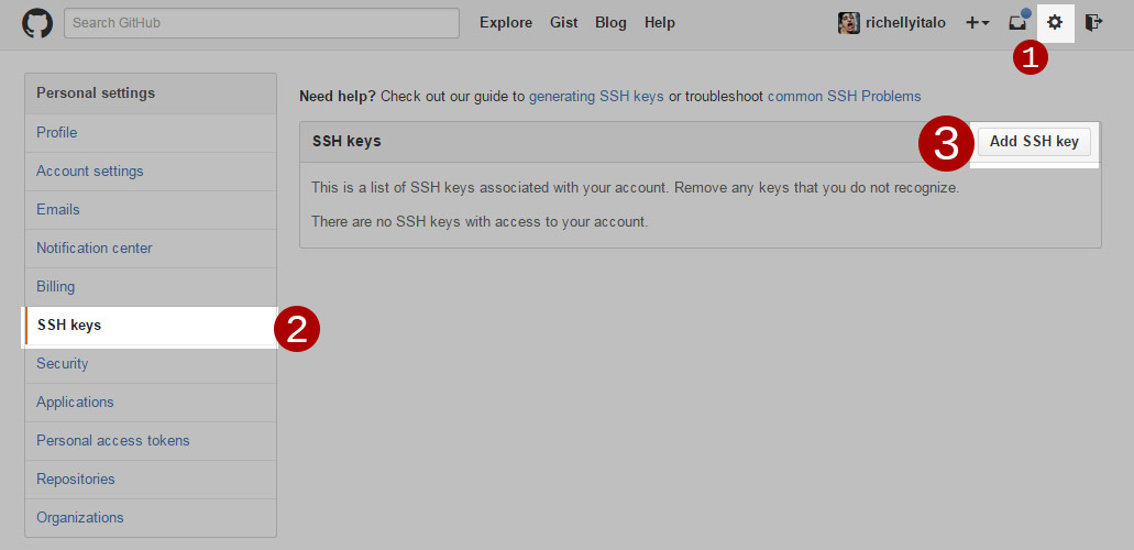 A seu lado direito estarão as SSH Keys que você permitirá a realização de pushes para seus projetos.
